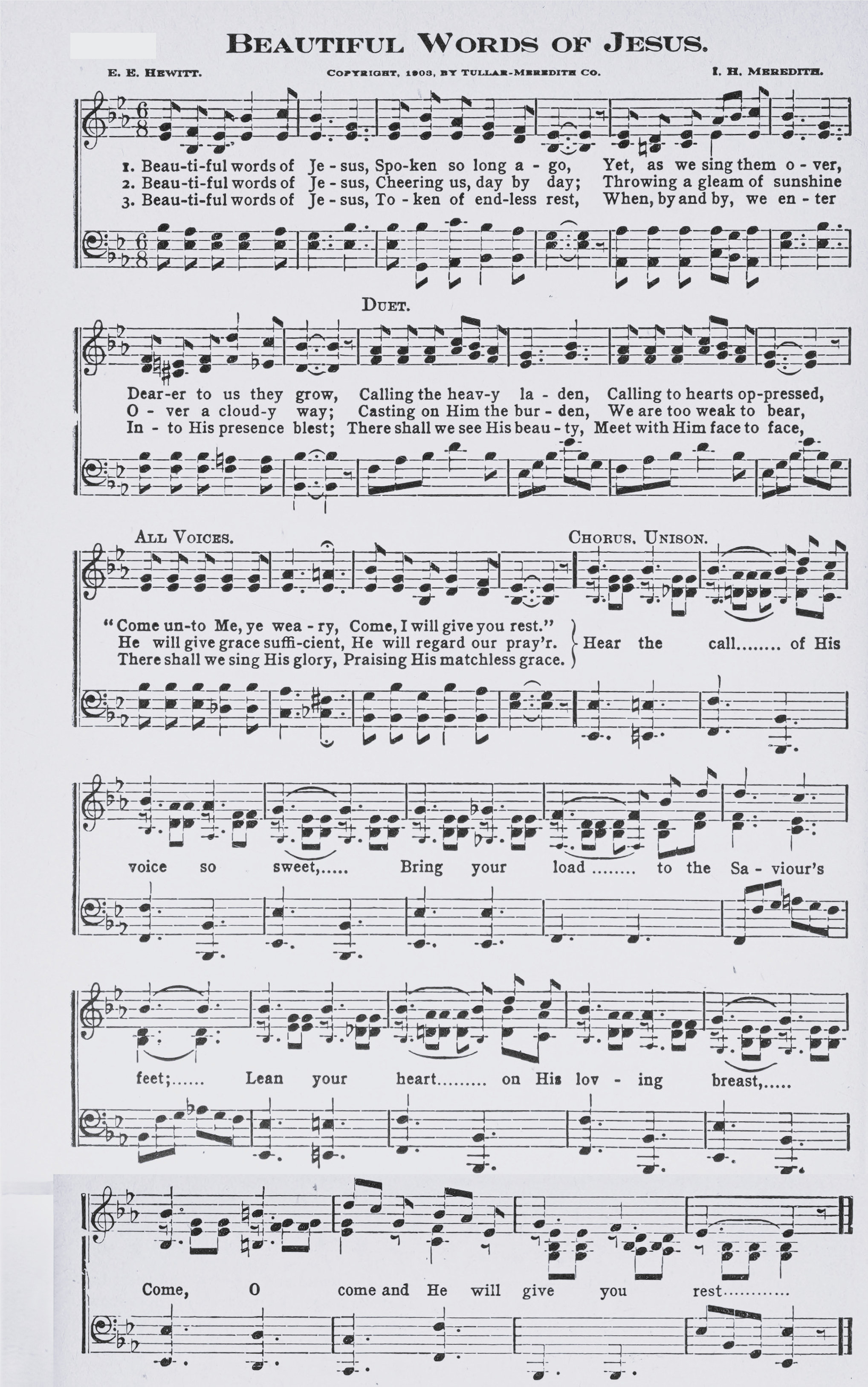 The hymn emphasizes that Jesus’ words bring assurance to the weary, light to those in darkness, and joy to the sorrowful. Hewitt’s background as a teacher of children shaped her ability to write lyrics that are both doctrinally rich and easily understood, making this hymn widely used in Sunday schools and church gatherings. The verses highlight various aspects of Christ’s ministry, including His call to salvation, His promises of peace, and His tender care for all who follow Him. The repeated theme of the “beautiful words of Jesus” reinforces the believer’s dependence on God’s Word as a foundation for faith and daily life.