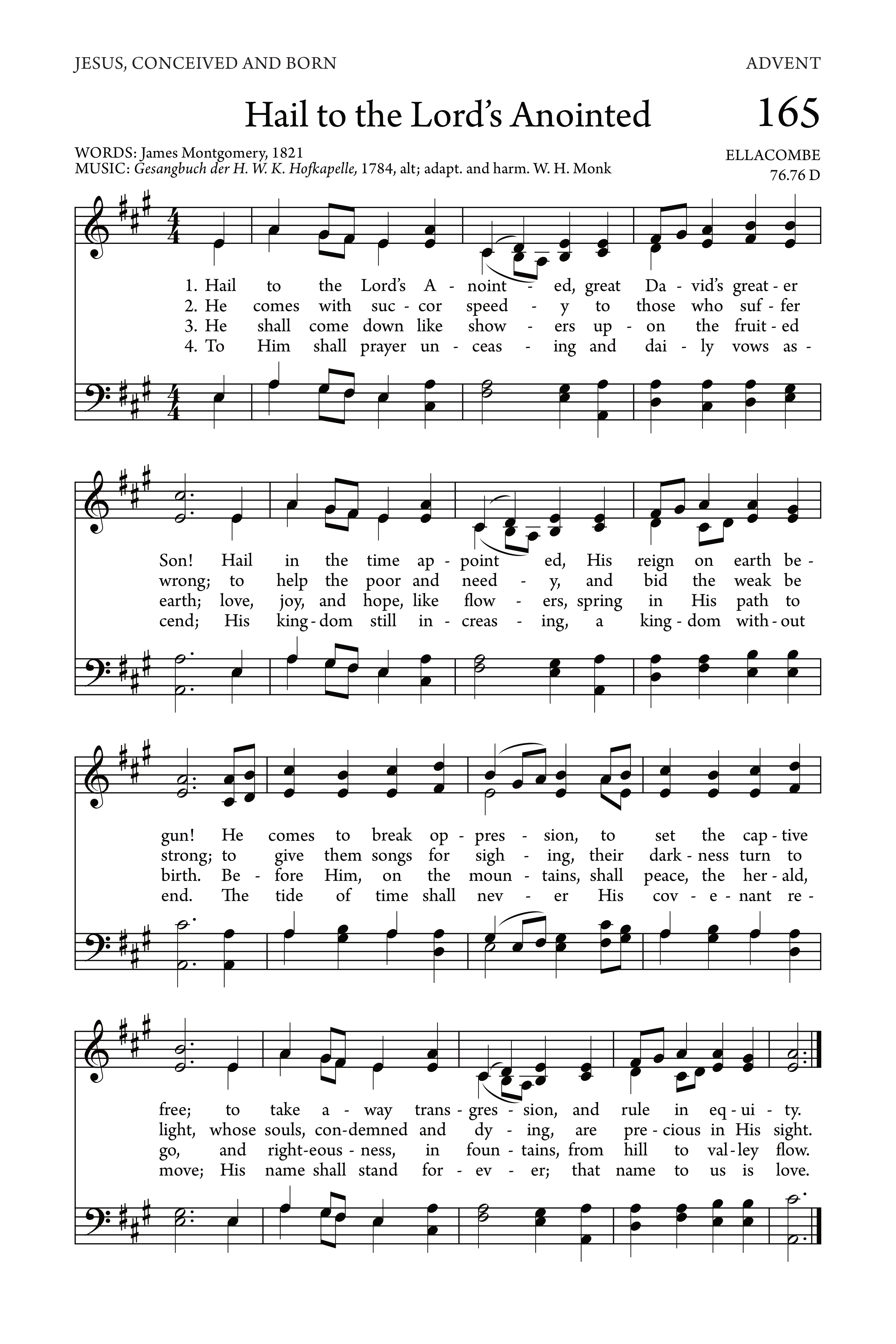 “Hail to the Lord’s Anointed” is one of James Montgomery’s most enduring hymns. It was composed as a paraphrase of Psalm 72, which speaks of the reign of a just and compassionate king. In the hymn, Montgomery greets Christ as the promised King who comes in appointed time to break oppression, free captives, help the weak, and usher in righteousness.