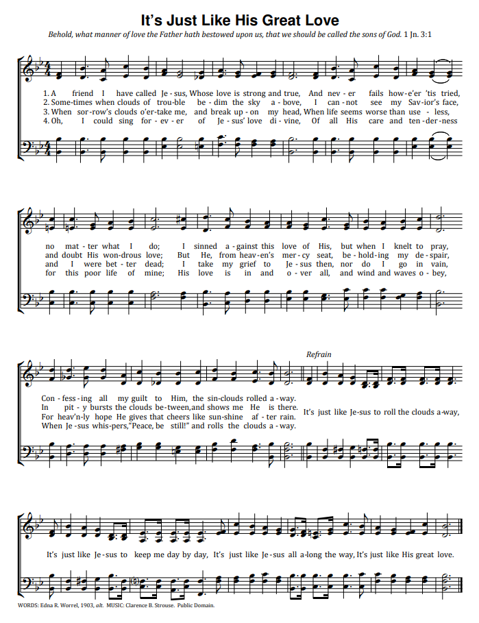 “It’s Just Like His Great Love” is a joyful and uplifting gospel hymn that celebrates the unfailing compassion and mercy of Jesus Christ. Written by Edna R. Worrell, the lyrics reflect personal testimony of God’s faithfulness during life’s troubles and trials. Each verse recounts how Christ lovingly responds to worry, sorrow, and sin—not with condemnation, but with forgiveness, grace, and peace.