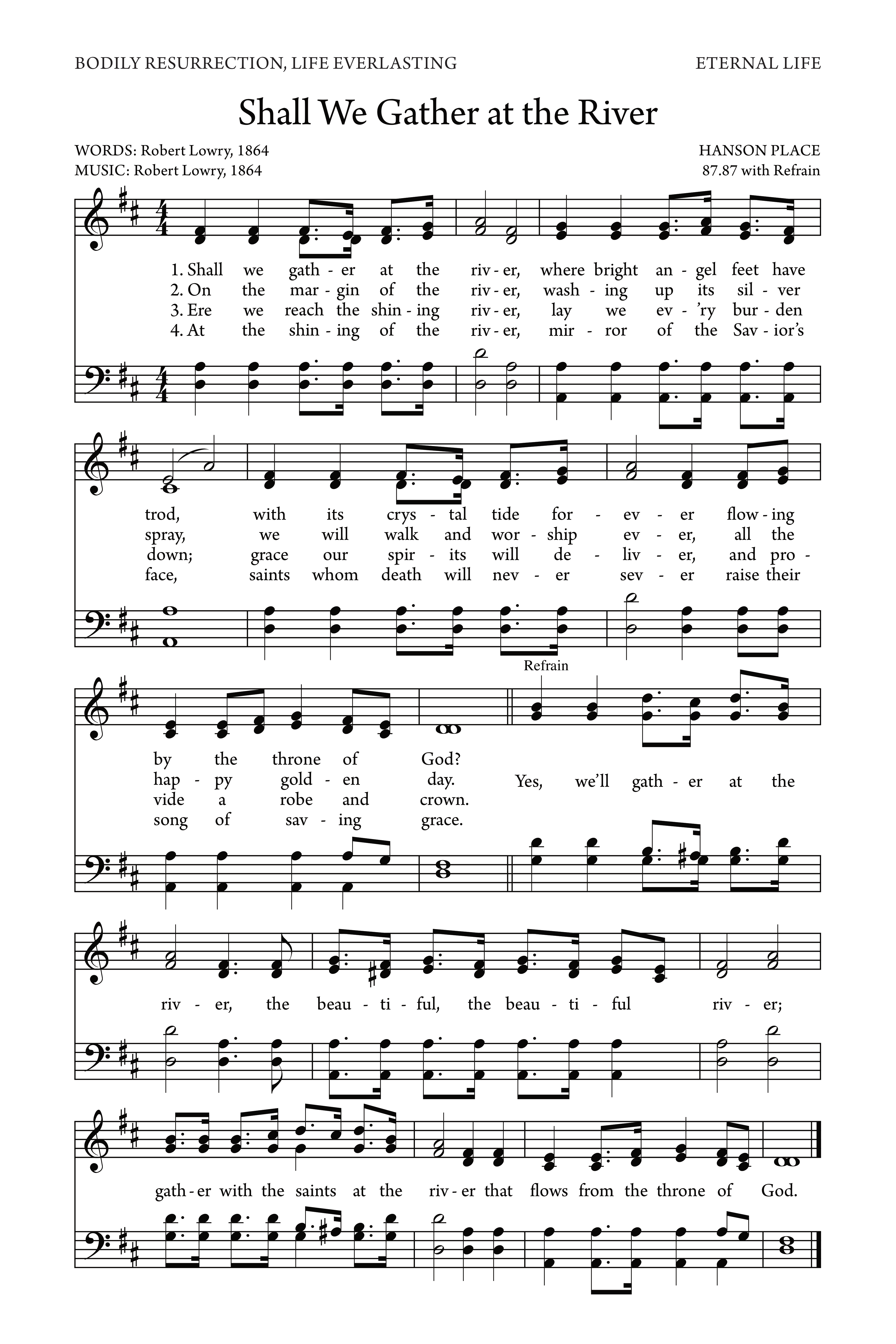“Shall We Gather at the River” was written in 1864 by the American preacher and hymn writer Robert Lowry, one of the most prolific gospel songwriters of the nineteenth century. The hymn was composed during the Civil War era, a time marked by tremendous loss and suffering across the United States. Lowry, then a Baptist minister serving in Brooklyn, New York, was deeply moved by the devastation and widespread death around him. In reflecting upon these sorrows, he turned to Scripture, especially Revelation 22:1, where John describes the river of life flowing from the throne of God. Inspired by this vision of eternal peace and restoration, Lowry penned a hymn that pointed believers to the hope of heaven and the ultimate gathering of God’s people at the eternal river.